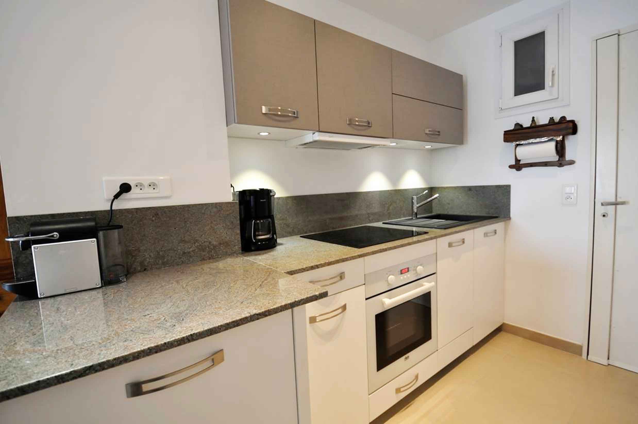 - Réfrigérateur-congélateur 2 portes, four, micro-ondes, plaque induction, hotte, cafetière à filtres + Nespresso à capsules, presse-fruits, lave-vaisselle, lave-linge.